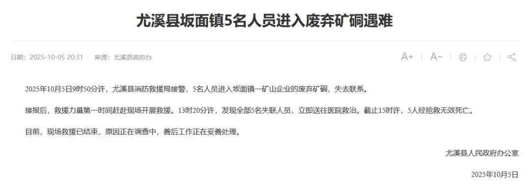10月5日晚,福建省三明市尤溪县政府办公室发布通报:“10月5日9时50分许,尤溪县消防救援局接警,5名人员进入坂面镇一矿山企业的废弃矿硐,失去联系。救援力量第一时间赶赴现场开展救援。13时20分许,发现全部5名失联人员,立即送往医院救治。截至15时许,5人经抢救无效死亡。目前,现场救援已结束,原因正在调查中,善后工作正在妥善处理。”