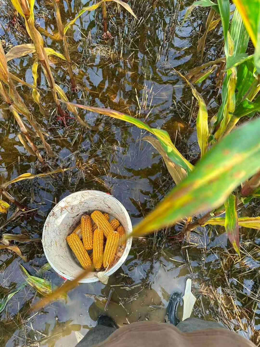 小时说,自己家的玉米地积水到小腿肚。周边有的农田积水更深。虽然积水到小腿肚,但是来来回回搬玉米,脚底下的泥地都变成了稀泥,非常容易陷进去,每走一步都不容易。“网上有人用铁皮盛着玉米,用车轮子绞绳把铁皮拽出来。这是个好办法。我们现在也在想各种办法。”