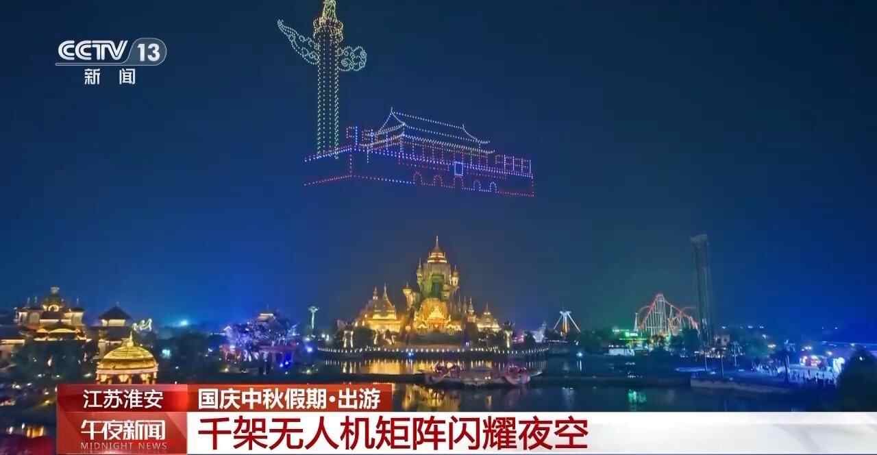 夜幕降临,在江苏淮安西游乐园,1600架无人机同步升空,组成“我爱你中国”、天安门、璀璨中国等造型图案,科技与光影的碰撞,谱写了一曲璀璨夺目的 “空中诗篇”。全新升级的“国庆烟花大会”更是将现场氛围推向高潮。绚烂的烟花与水幕交织相映,形成了一幅立体画卷,营造出了既浪漫又热烈的节日氛围。