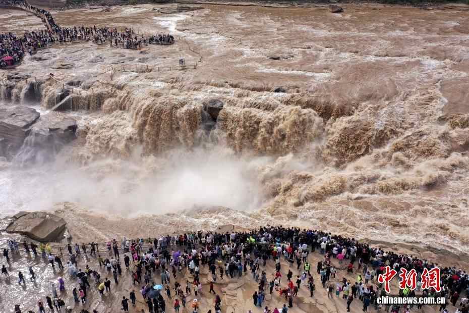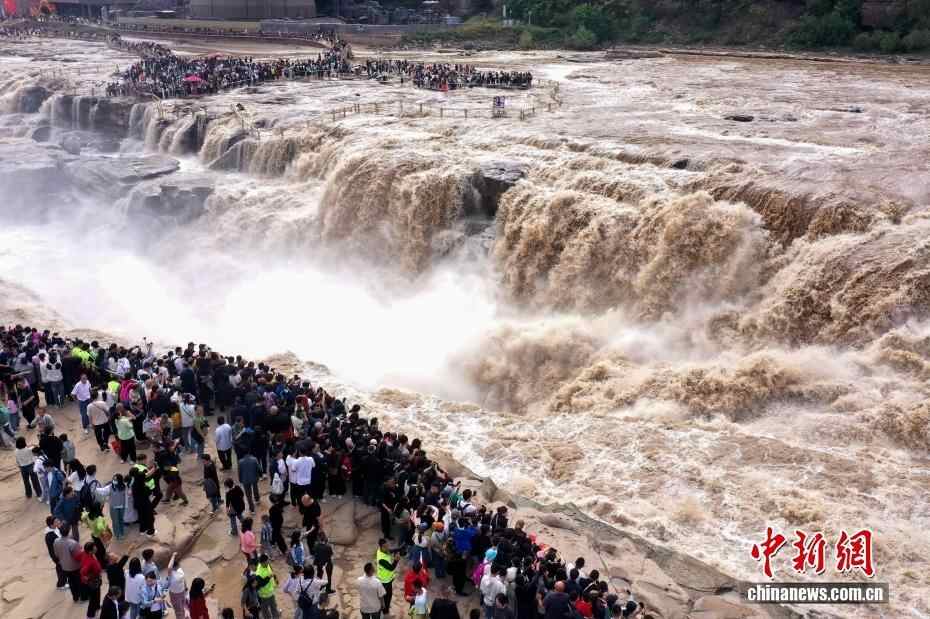 10月3日,大批游客在黄河壶口瀑布景区游览观瀑。当日是国庆中秋假期第三天,位于山西吉县和陕西宜川县交界的黄河壶口瀑布景区迎来假期客流高峰。(无人机照片)