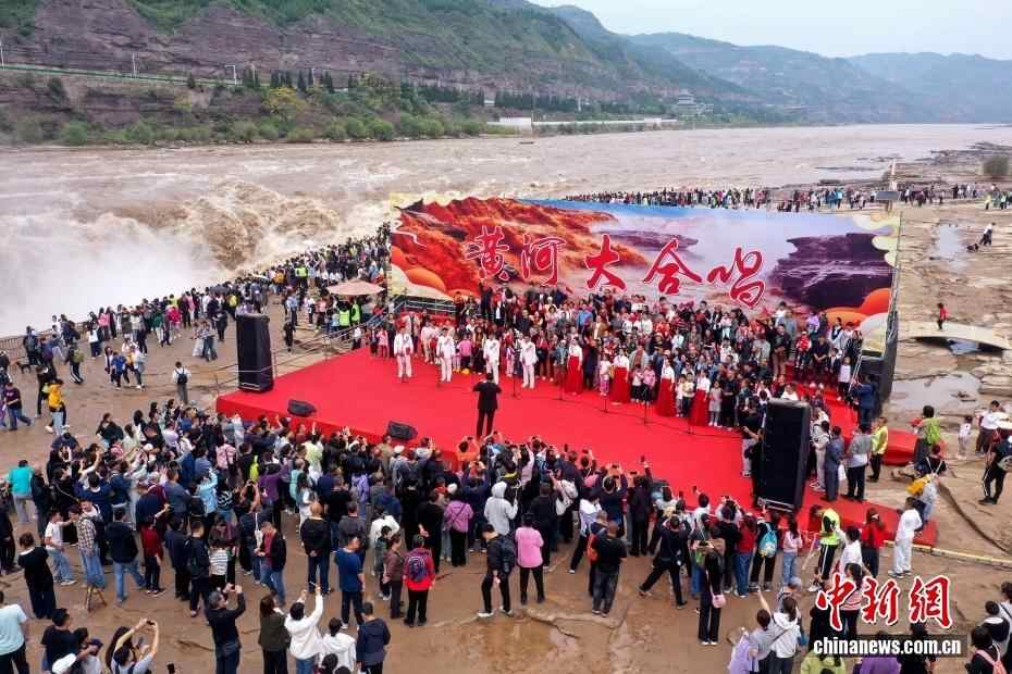 10月3日,游客在黄河壶口瀑布景区参与演唱《黄河大合唱》。当日是国庆中秋假期第三天,位于山西吉县和陕西宜川县交界的黄河壶口瀑布景区迎来假期客流高峰。(无人机照片)