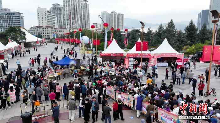 图为民众排队等候美食出锅。(无人机照片) 中新社记者 马铭言 摄