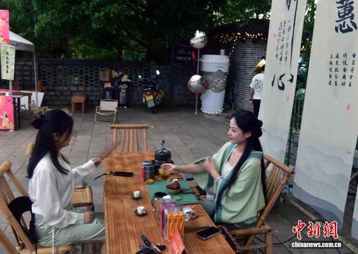 图为游客在景区品茶。中新网记者 张丽君 摄