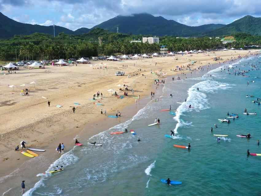 10月2日,游客在海南万宁日月湾冲浪(无人机照片)。
