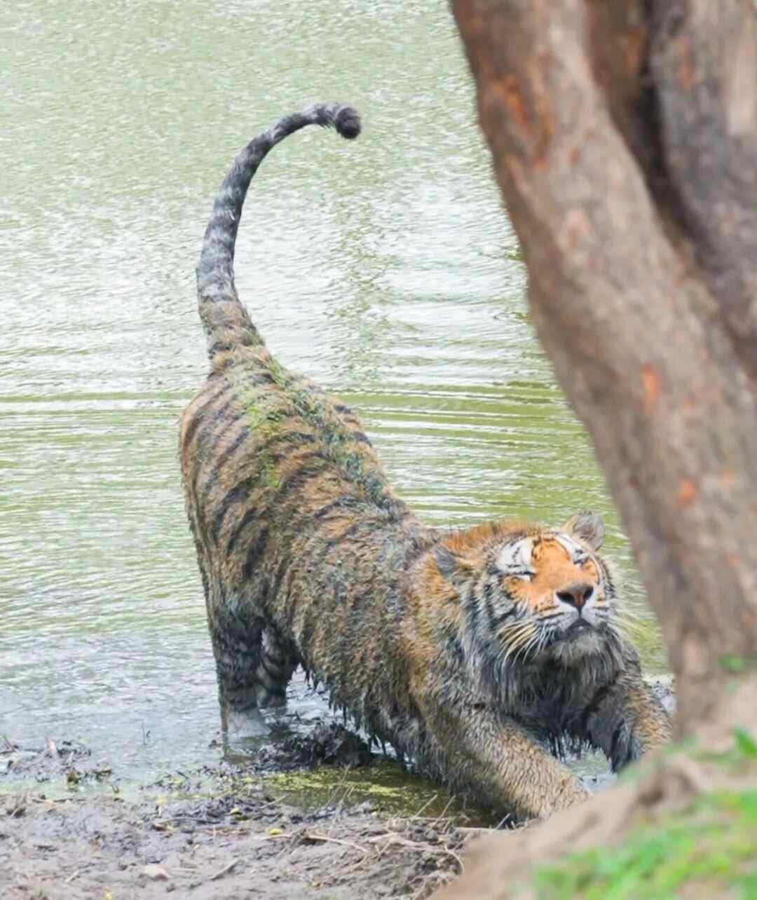 近日,黑龙江东北虎林园有游客拍下一身黑泥的东北虎“二埋汰”。
