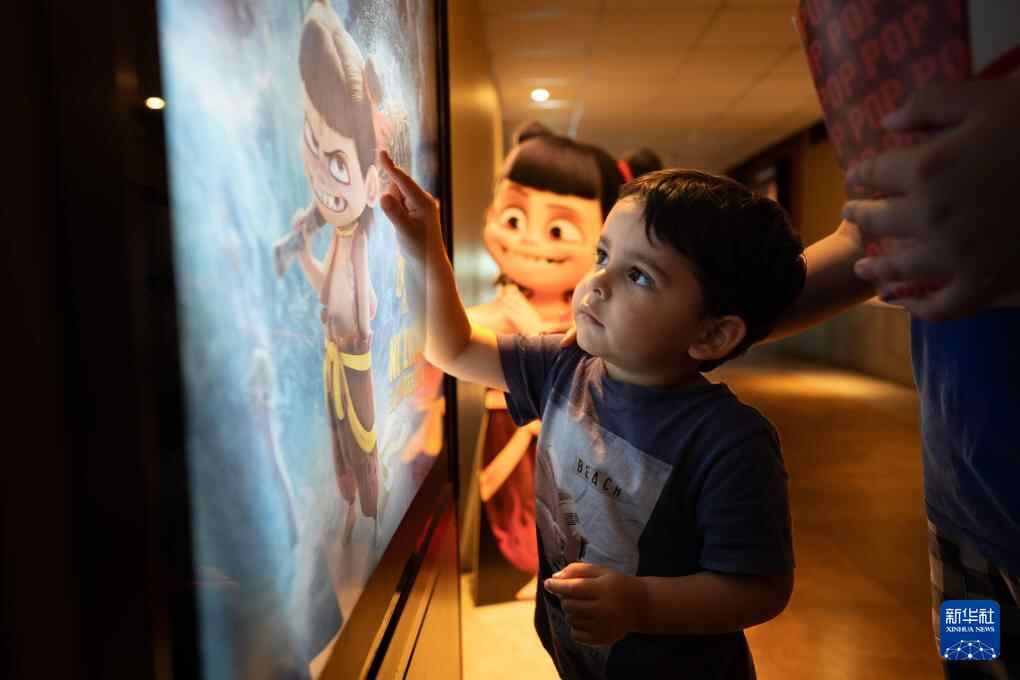 10月2日,一名男孩在阿根廷首都布宜诺斯艾利斯的影院观看《哪吒2》海报。