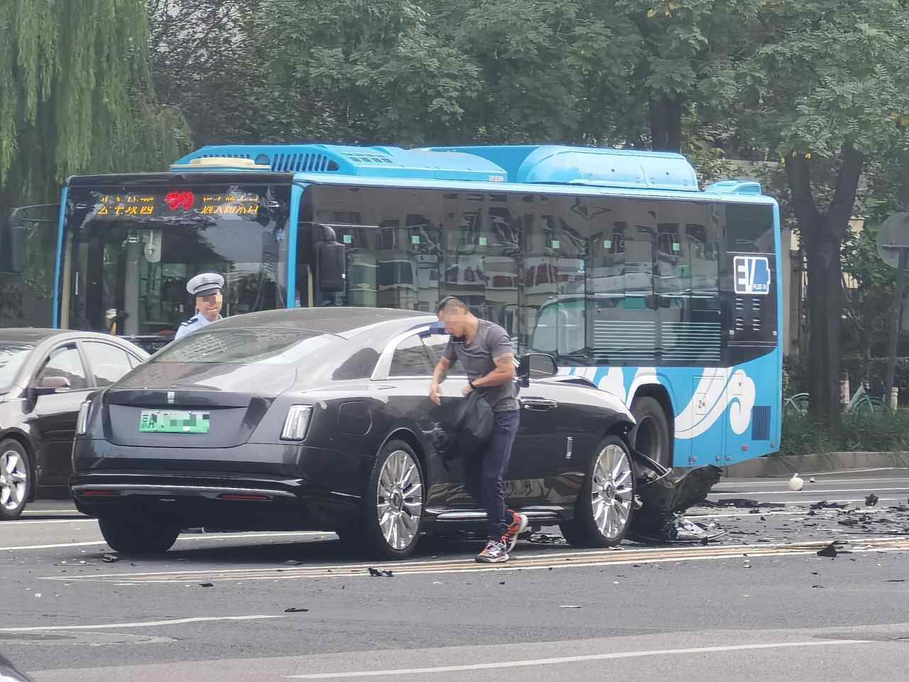 网传照片显示,一辆劳斯莱斯闪灵轿车停在公路上,车身损毁严重,安全气囊弹出。车外人员疑似知名车评人陈震。记者对比该车的车牌号,与此前媒体曝光的车评人陈震的车辆为同一号牌。有网友称,该事故发生在北京万寿路。