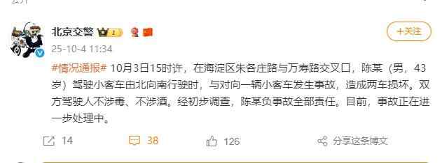 10月3日15时许,在海淀区朱各庄路与万寿路交叉口,陈某(男,43岁)驾驶小客车由北向南行驶时,与对向一辆小客车发生事故,造成两车损坏。双方驾驶人不涉毒、不涉酒。经初步调查,陈某负事故全部责任。目前,事故正在进一步处理中。