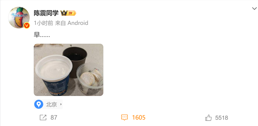 10月4日当天,陈震连发两条微博,发布一张早餐照和一条产品开箱内容。有网友在评论区问车祸相关,本人并未回应。