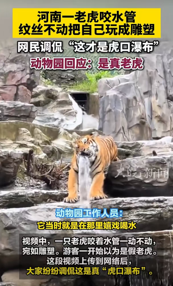 视频中,一只老虎咬着水管一动不动,宛如雕塑。游客一开始以为是假老虎。这段视频上传到网络后,大家纷纷调侃这是真“虎口瀑布”。