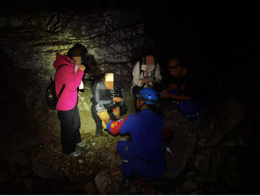 上山途中岔路很多,经验丰富的队员们需不断修正方向。22时许,队员们找到3名被困者,当时3人处在一处3米高的断崖下,询问得知,他们身体状况无大碍,只是有一名被困者左膝盖有点受伤,队员们赶紧把带来的食物和水发给他们,同时想办法怎么才能把三人安全转移到断崖上方。