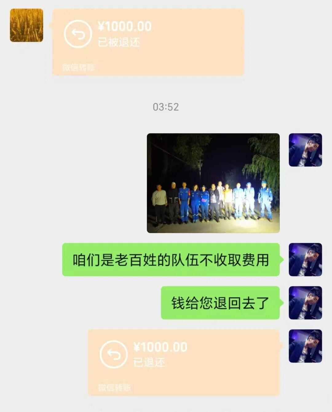 “钱给您退回去了,咱们是老百姓的队伍,不收取费用。”事后,被救者给队员转来1000元表示感谢,队员当时就退回去了,“不动老百姓的一针一线,这是房山蓝天救援队的铁律,不记得这是多少次把钱退还给被救者了,被救助者想用这种方式表达感谢,但只要他们平安我们就知足了。”
