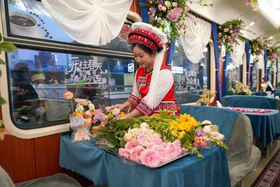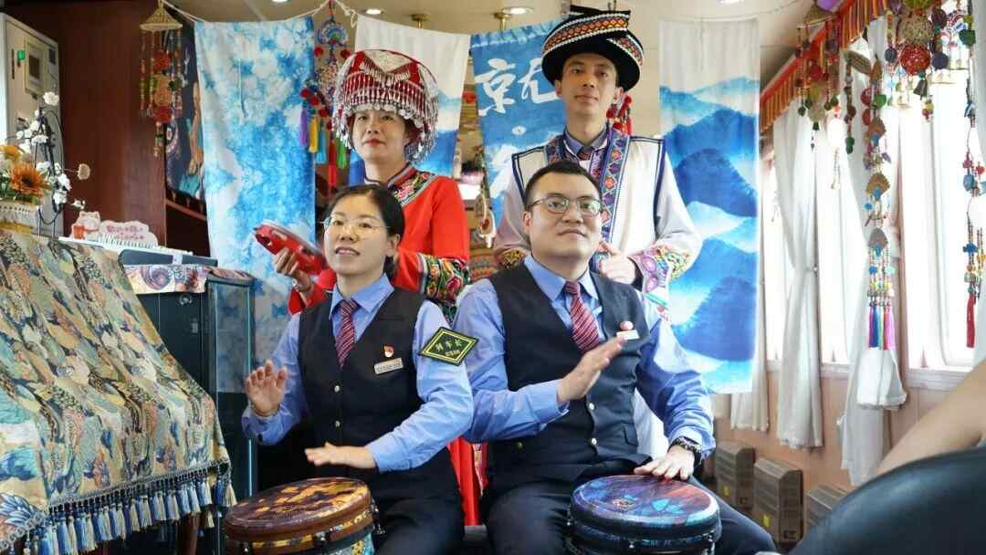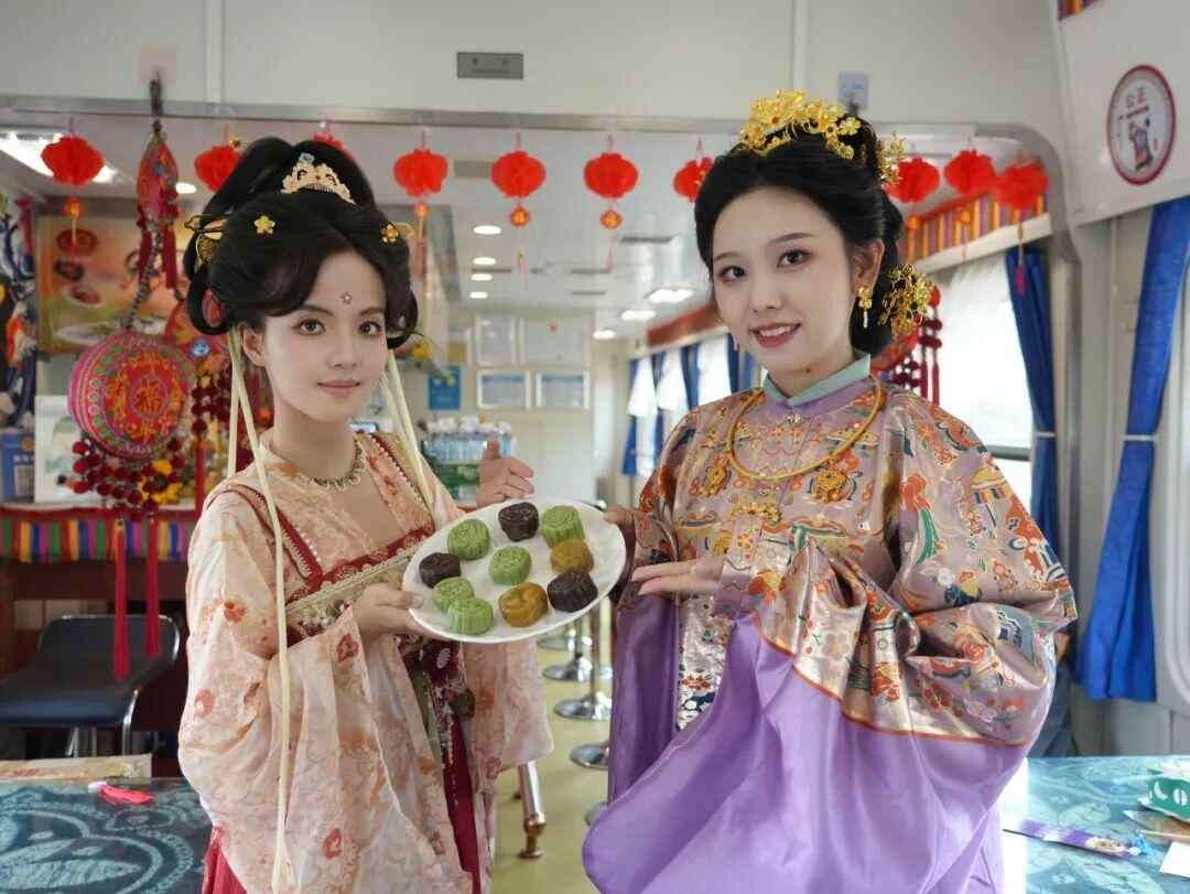 “旅客朋友们,欢迎乘坐本趟列车,中秋佳节将至,我们在2号餐车准备了特色活动,诚邀大家共庆佳节!”列车长李文雯的声音通过广播传遍车厢。随即《纳西三部曲》旋律响起——身着绚丽民族服饰的列车员们,拉着周围旅客一同跳起纳西族舞蹈,欢快的节奏瞬间点燃车厢气氛。