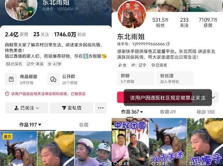 2024年10月,“东北雨姐”的短视频平台账号因违反相关法律法规和政策被禁言。