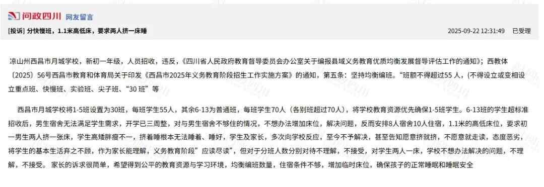 记者注意到,9月22日,针对该网友的反映,凉山州人民政府办公室回复表示,承办单位正在处理。9月29日,凉山州人民政府办公室工作人员告诉记者,会向学校了解投诉处理情况,及时做回复。