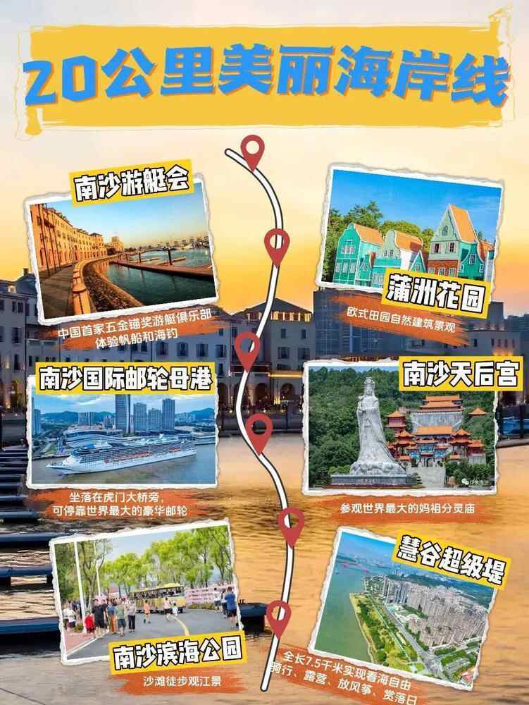 推荐路线:南沙游艇会→蒲洲花园→广州南沙国际邮轮母港→南沙天后宫→南沙滨海公园→南沙慧谷超级堤