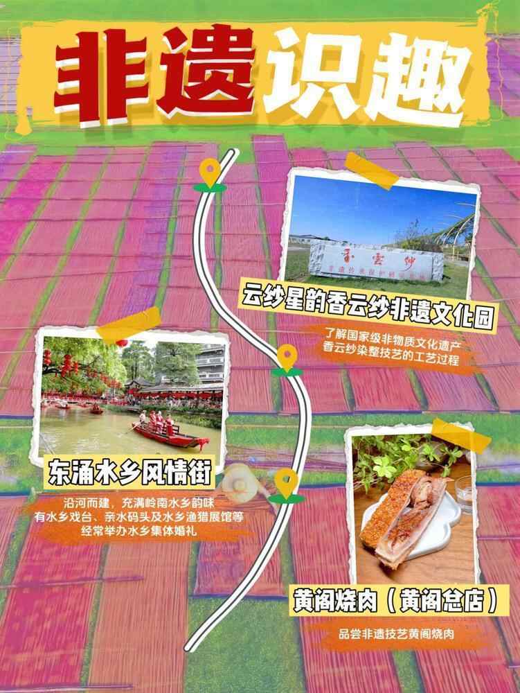 推荐路线:云纱星韵香云纱文化产业园→东涌水乡风情街→黄阁烧肉(黄阁总店)