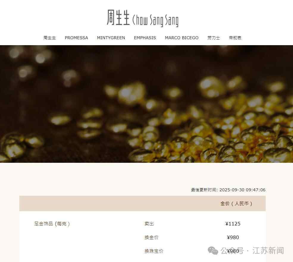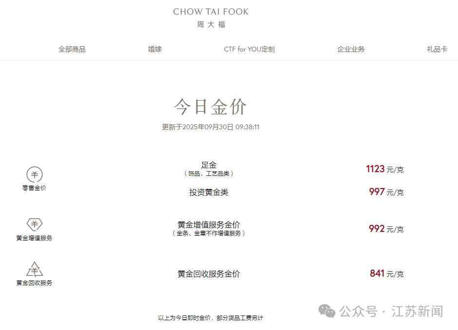 9月30日,国内多家黄金珠宝品牌金饰价格持续攀升,其中,周生生足金饰品报价1125元/克,较昨日上涨14元/克;周大福、六福珠宝等多个品牌报1123元/克,较昨日上涨15元/克。