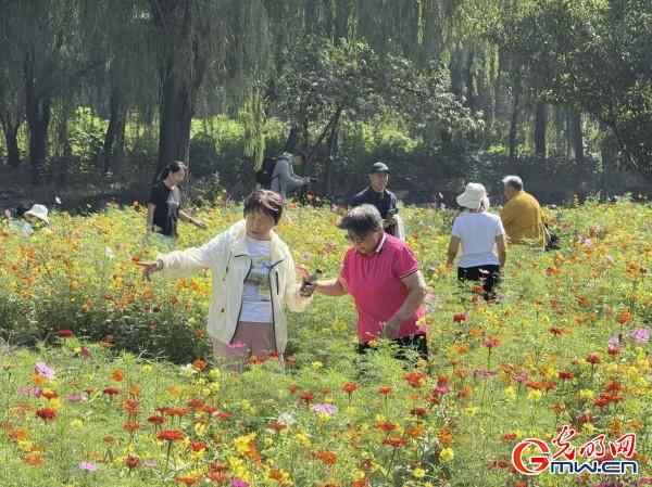 相比于数字化项目主要吸引年轻人群体,圆明园还依靠自身丰富的自然生态资源,针对中老年客群打造了西部花海。花海总面积1万余平方米,种植了美丽月见草、百日菊、波斯菊、孔雀草等10余种草本花卉,颜色艳丽。9月中下旬恰逢盛花期,吸引了不少各年龄层次的游客及本地群众前来拍照打卡。