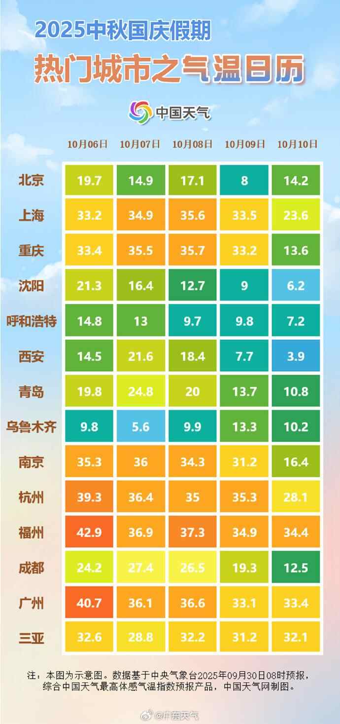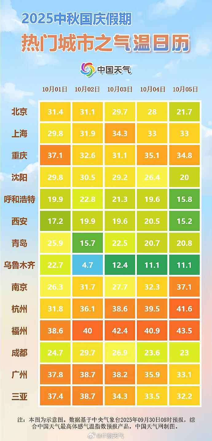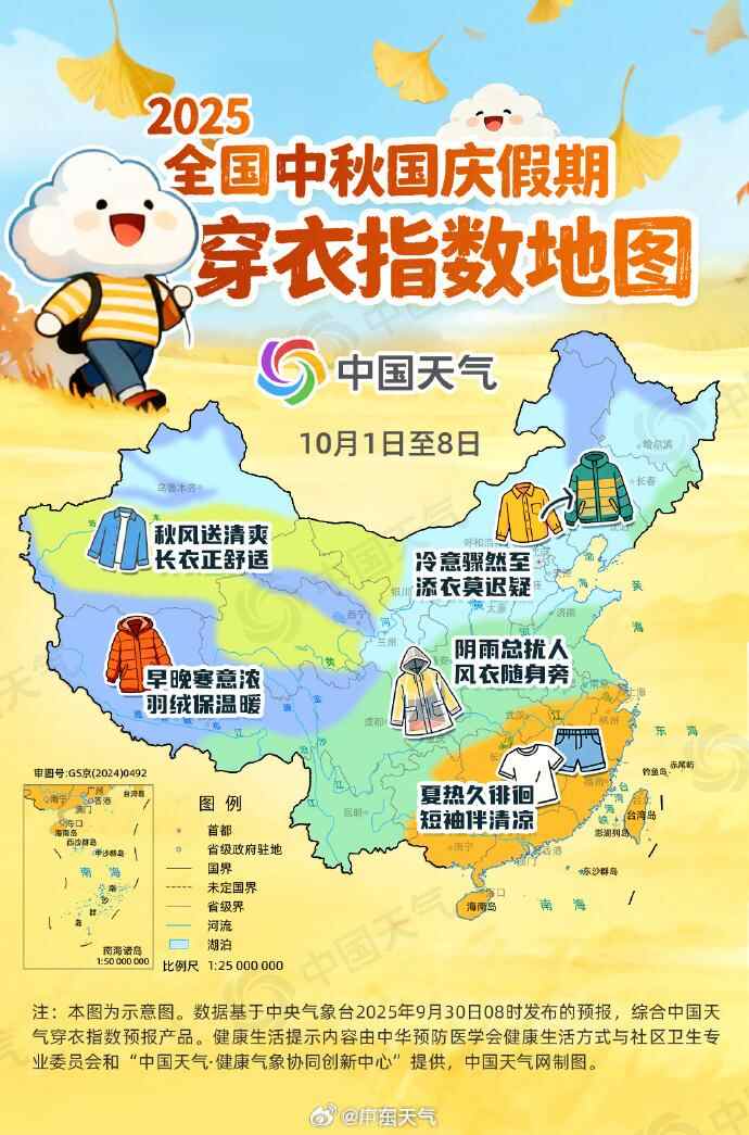派派君提醒广大游客,关注南北温差和目的地天气变化,提前准备合适的衣物和雨具等装备,快乐平安出游。这份《全国国庆中秋假期穿衣指数地图》请收藏!