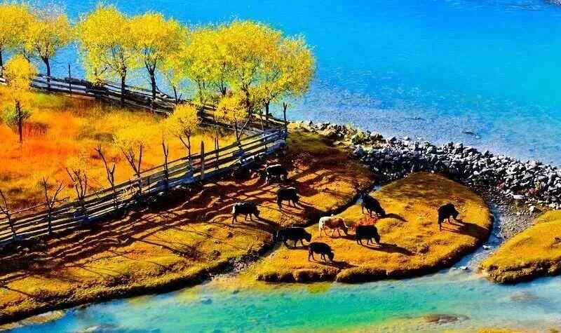 雅鲁藏布江的浓郁密林,在秋意渐浓的现在,正将金黄披在身上。江水变得沉寂起来,犹如一块上好的蓝宝石,点缀其间,美得惊心动魄。