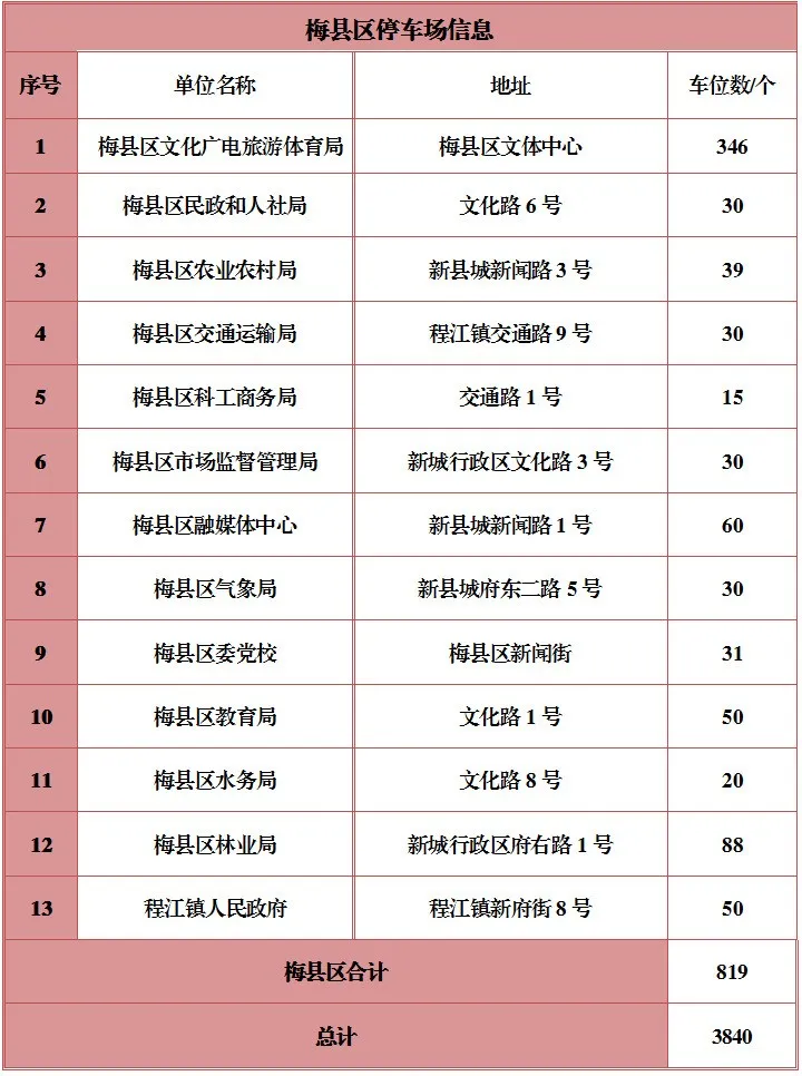 据梅州市文明办消息,2025年国庆期间,梅州城区部分机关事业单位停车场,共计3840个停车位将对外免费开放。