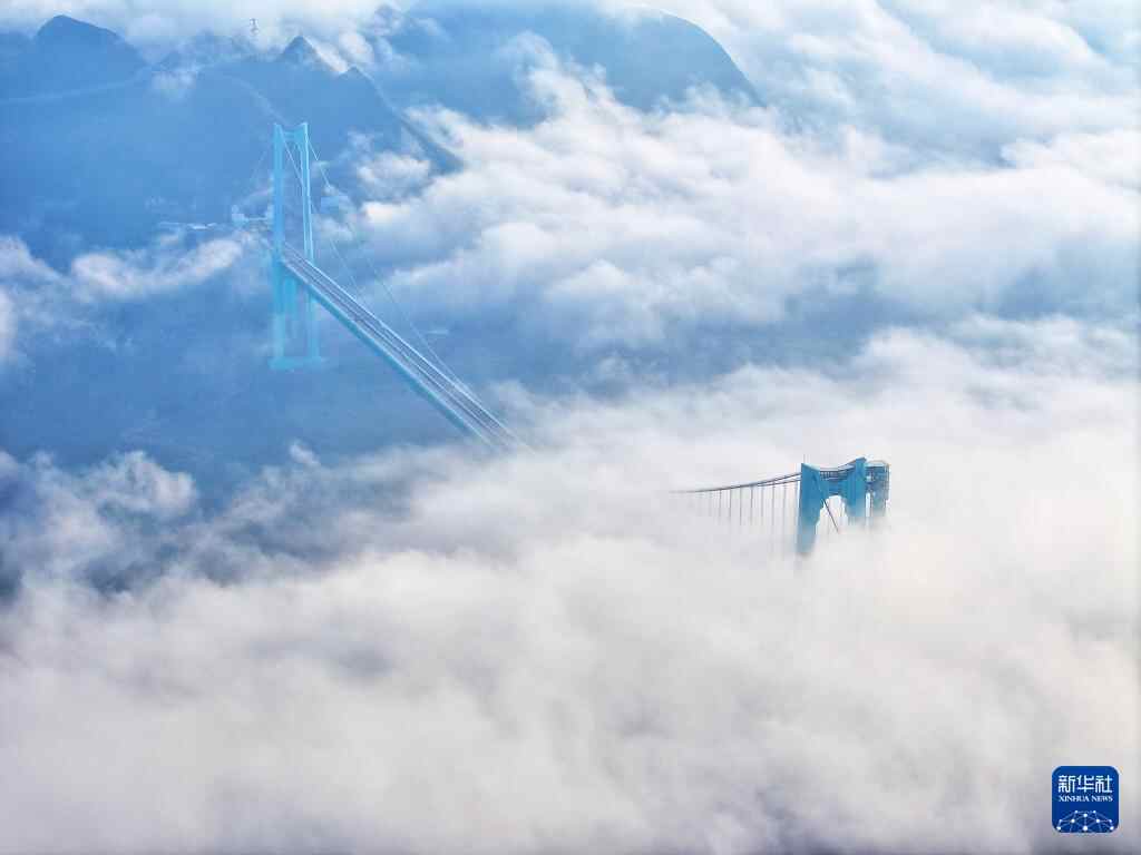9月26日拍摄的云雾中的贵州花江峡谷大桥(无人机照片)。