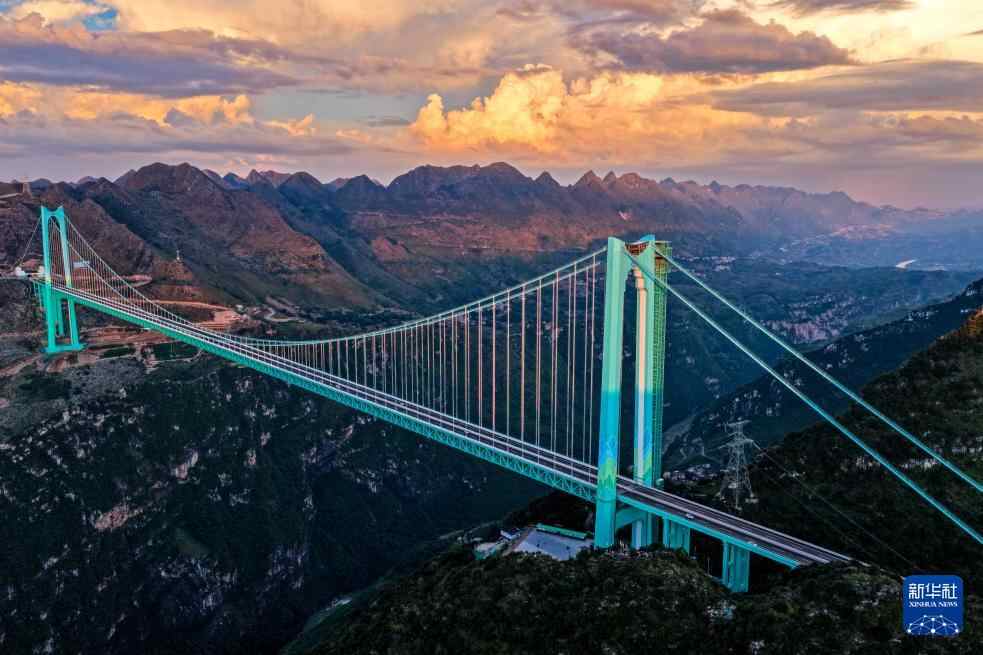 9月28日拍摄的夕阳下的贵州花江峡谷大桥(无人机照片)。