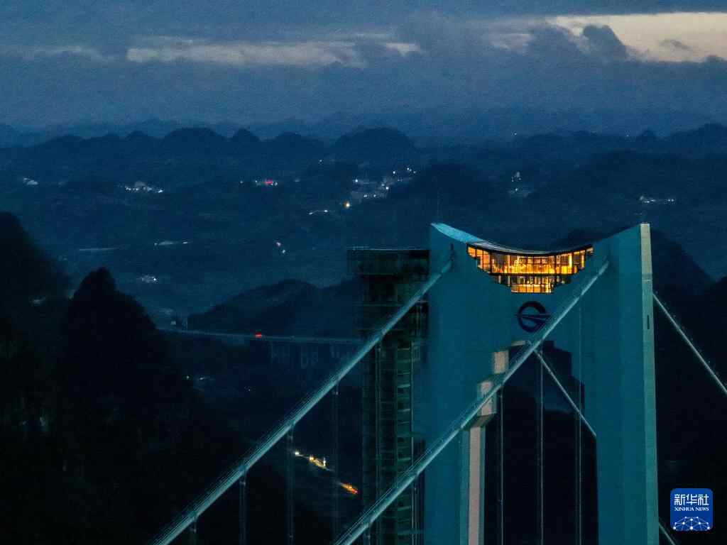 9月27日拍摄的夜幕下的贵州花江峡谷大桥(无人机照片)。