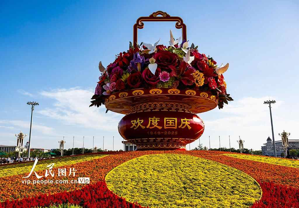 9月25日,“祝福祖国”巨型花篮亮相天安门广场。郑家裕摄(人民图片网)