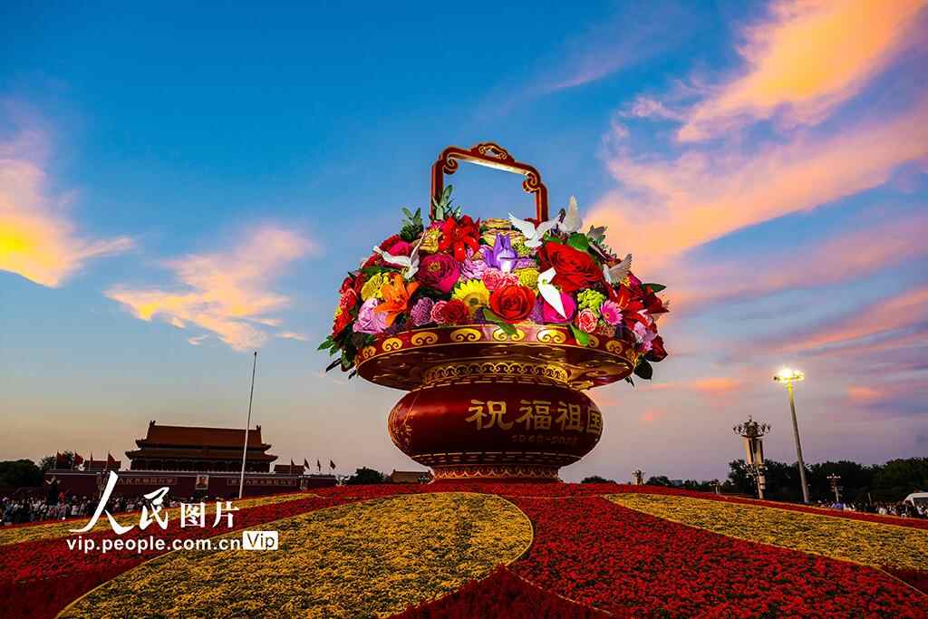 9月25日,“祝福祖国”巨型花篮亮相天安门广场。郑家裕摄(人民图片网)