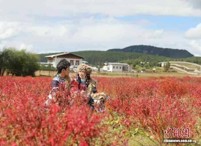 9月28日,两名身穿藏族服装的游客在小中甸欣赏美景。当日,入秋的云南省迪庆藏族自治州香格里拉市,狼毒变红,树叶变黄,风景如画,吸引各地游客前来观光。中新社记者 黄兴鸿 摄