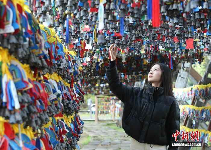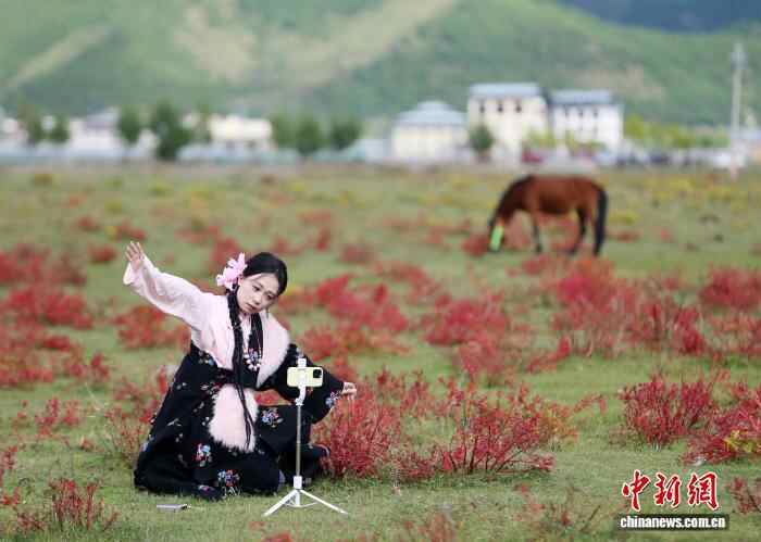 9月28日,一名身穿藏族服装的游客在小中甸自拍。地处云南省西北部的迪庆藏族自治州香格里拉市,藏语意为“心中的日月”,是世人向往的世外桃源。入秋后,当地的狼毒变红,树叶变黄,风景如画,吸引各地游客前来观光。中新社记者 黄兴鸿 摄