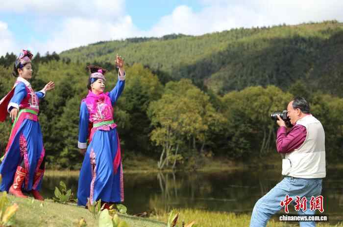 9月28日,一名身穿彝族服装的游客在普达措国家公园起舞。当日,入秋的云南省迪庆藏族自治州香格里拉市,狼毒变红,树叶变黄,风景如画,吸引各地游客前来观光。中新社记者 黄兴鸿 摄