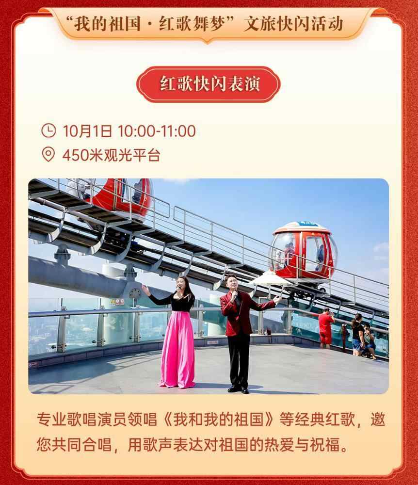 据悉,广州塔旅游区在国庆假期期间,将举办“我的祖国·红歌舞梦”文旅快闪活动。10月1日和10月2日到访广州塔旅游区的游客,可在450米观光平台、登塔大厅、二楼轮候区等地,看到民族舞蹈快闪、民族服饰巡游、红歌快闪等活动的举办。相关活动具有互动性,游客既可观看,也可跟着演员一同参与。