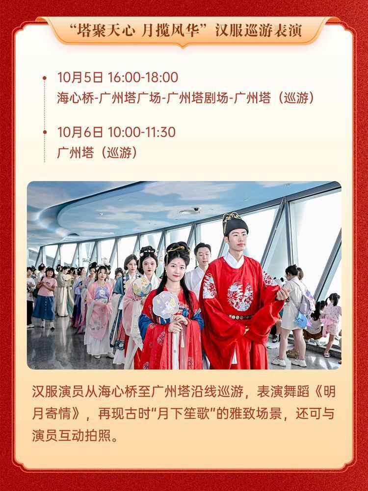 国庆假期期间,广州塔旅游区将举办“塔聚天心 月揽风华”汉服巡游表演。10月5日16时至18时,以及10月6日10时至11时30分,游客可在海心桥、广州塔广场、广州塔剧场、广州塔等地,看到身着汉服演员巡回表演舞蹈《明月寄情》,再现古时“月下笙歌”的雅致场景。