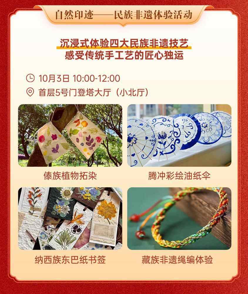 国庆假期期间,广州塔旅游区还将举办“自然印迹—民族非遗体验活动”。在10月3日10时至12时,可在首层5号门登塔大厅,欣赏傣族植物拓染、腾冲彩绘油纸伞、纳西族东巴纸书签、藏族非遗绳编等我国多项民族非遗技艺。