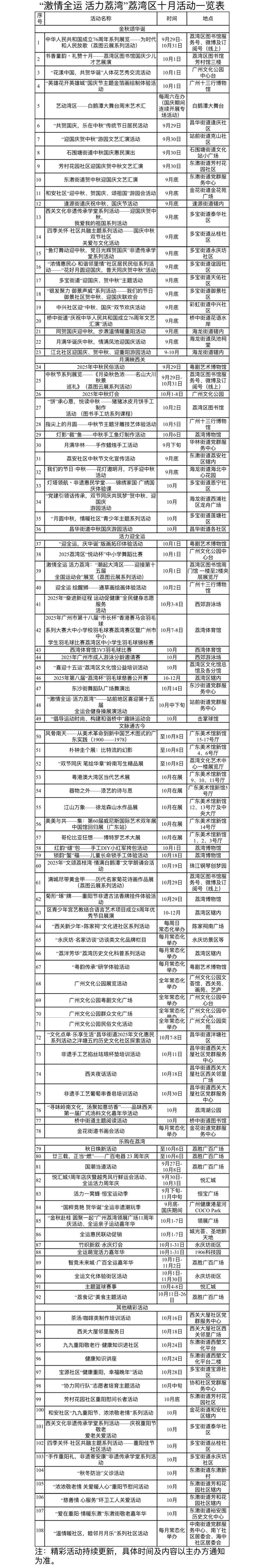 金秋十月,佳节迭至,盛事将启。广州市荔湾区以“庆国庆·贺中秋·迎全运”为主线,在10月推出一系列丰富多彩的文商旅体活动,持续营造“激情全运 活力荔湾”的浓厚氛围,诚邀市民游客到荔湾共襄金秋盛宴。
