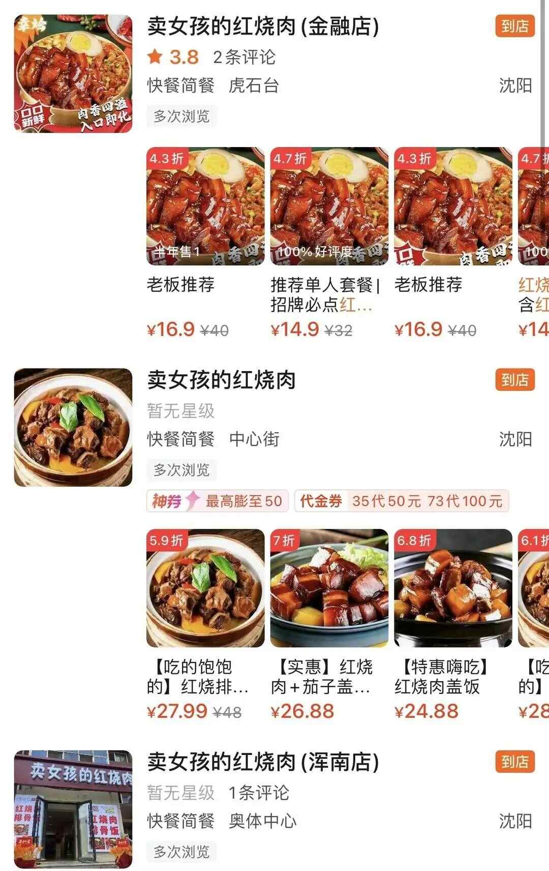 在某餐饮点评平台,记者发现沈阳市有三家名为“卖女孩的红烧肉”店,登记地址分别在沈北新区、浑南区和康平县。且三家店面的涉及“卖女孩的红烧肉”字样的图片均已删除。
