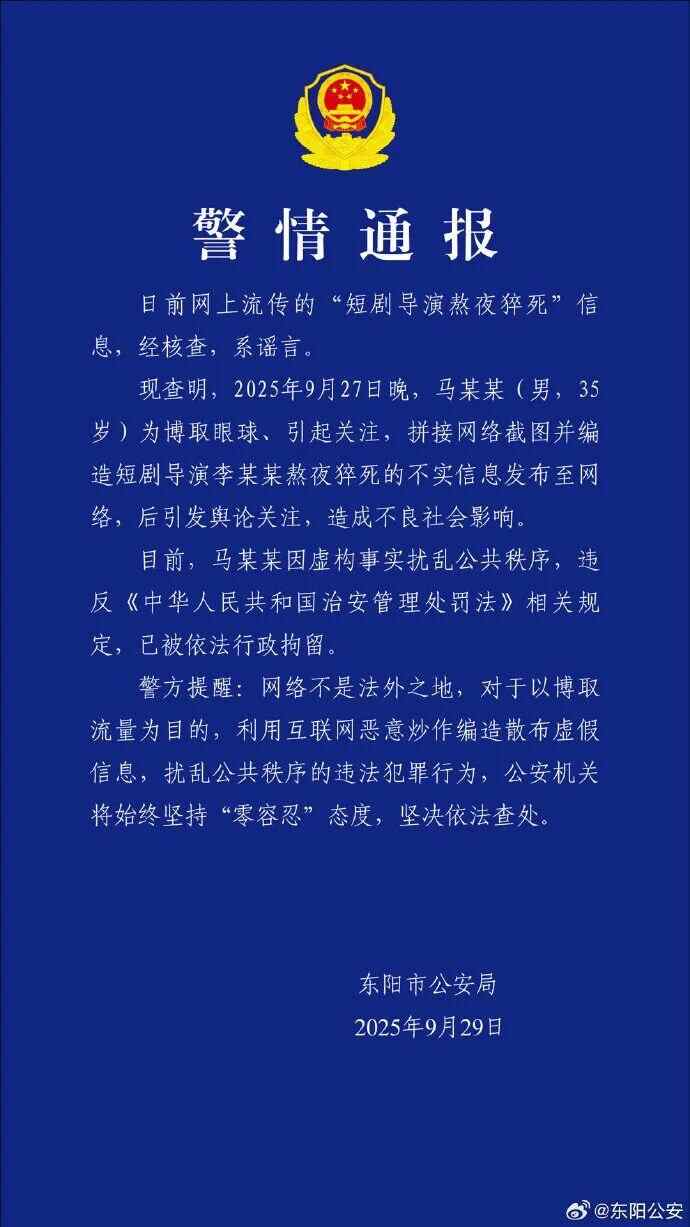 9月29日,东阳市公安局就网传“短剧导演熬夜猝死”信息发布警情通报,全文如下: