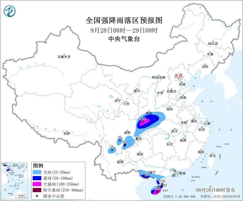 预计,9月28日08时至29日08时,四川东部和南部、陕西南部、河南西部、湖北西北部、重庆西部和北部、云南北部、广西南部、广东西南部、海南岛等地部分地区有大到暴雨,其中,陕西南部、四川盆地北部、海南岛中南部等地部分地区有大暴雨,海南岛东南部局地特大暴雨(250~280毫米)。上述部分地区伴有短时强降水(最大小时降雨量20~50毫米,局地可超过60毫米),局地有雷暴大风等强对流天气。
