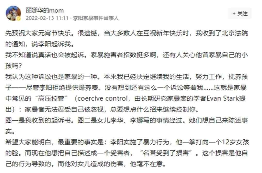 2022年2月13日,Kim在社交平台上发文显示,李阳等人起诉Kim等人的网络侵权责任纠纷一案,2021年12月29日北京互联网法院已立案,法院通过传票通知她应诉。