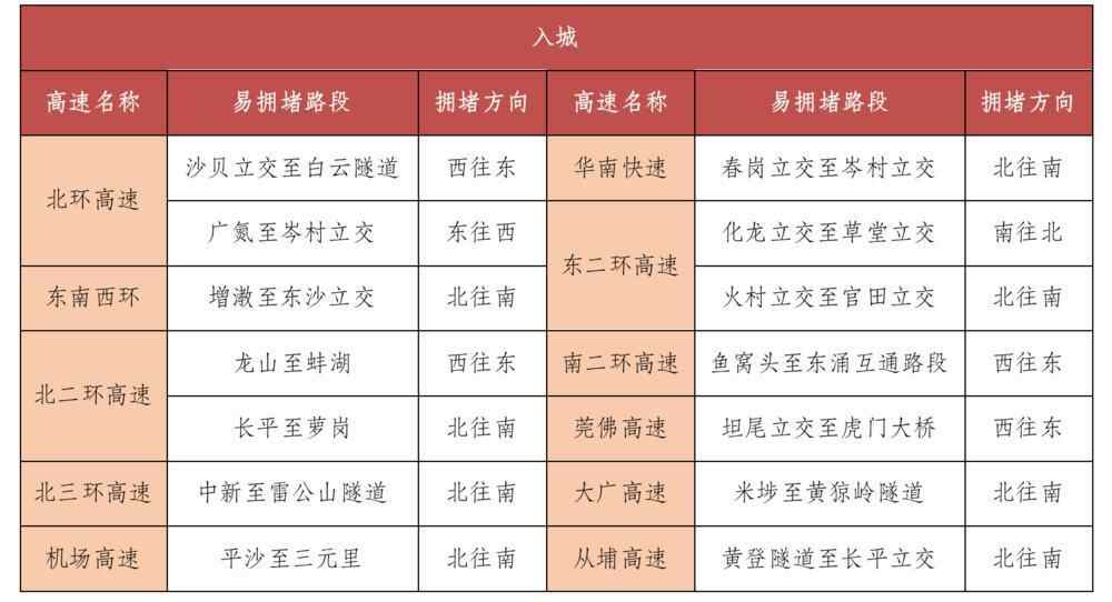 返程方向上,易缓慢路段主要集中在北环高速、东南西环高速、北二环高速、北三环高速、机场高速、华南快速、东二环高速、南二环高速、莞佛高速等路段隧道、互通立交等位置。