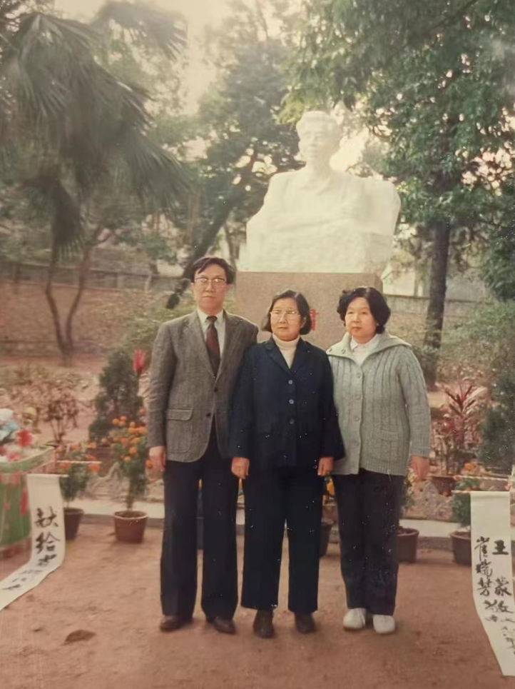 王蒙夫妇与萧殷夫人陶萍在萧殷雕像前合影