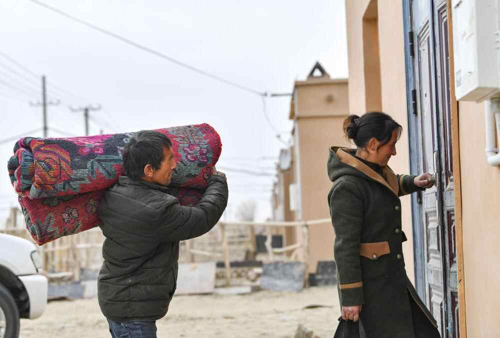 依明·买提库尔班(前)和妻子抬着行李跨出老家的篱笆墙,准备乘车前往安置点(2019年11月17日摄)。