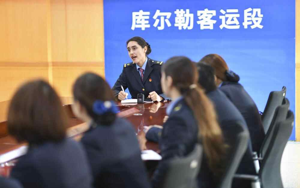 在中国铁路乌鲁木齐局集团有限公司库尔勒客运段办公楼,艾尔开牙·多力开带领同事开展值乘前的业务学习(2025年1月15日摄)。