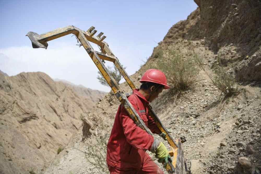 电力工人在新疆塔什库尔干塔吉克自治县的深山中安装用于放线的零件(2019年11月23日摄)。