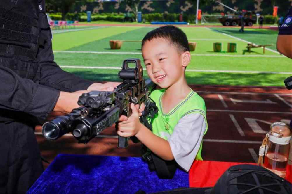 这里“虚实相生”:特种装甲车、防弹头盔、防弹衣、防弹盾牌、破拆装备等特种装备,让市民亲手感受守护城市安全的“硬核”力量;模拟射击、兵棋推演项目,让参与者在游戏中学习军事知识;无人机激光射击与无人机搬运体验,展现科技在国防领域的应用,大家踊跃参与,现场欢声笑语不断。