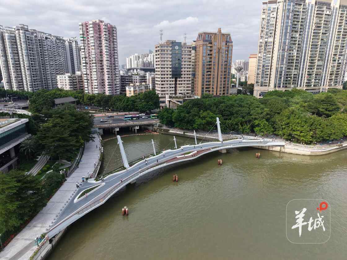 桥面功能分区清晰,设有3米宽步行道和2米宽跑步道,配备休息座椅、绿化花池,采用防滑铺装并设置安全护栏,确保老人、儿童通行安全,真正实现了健身休闲两不误。站在桥上,可眺望“一塔一城”,将白天鹅宾馆、63层、二沙岛、广州塔、珠江新城天际线等美景尽收眼底,成为连接珠江美景与沿岸文商旅资源的“观景之窗”。