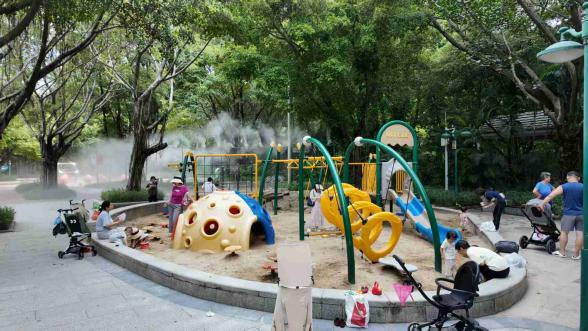 这份温暖,渗透在公园每个细节里。蜿蜒全园的无障碍通道如一条条隐形臂膀,温柔托起轮椅和婴儿车的出行;1300平方米的儿童游乐及健身区域内,80个防暑喷雾喷头每隔2分钟便定时开启,在水雾中嬉戏的孩子们笑声清脆;转角可见的彩虹伞、便民药箱和休憩长椅,也于细微处无声诉说着这座城市的人文关怀。